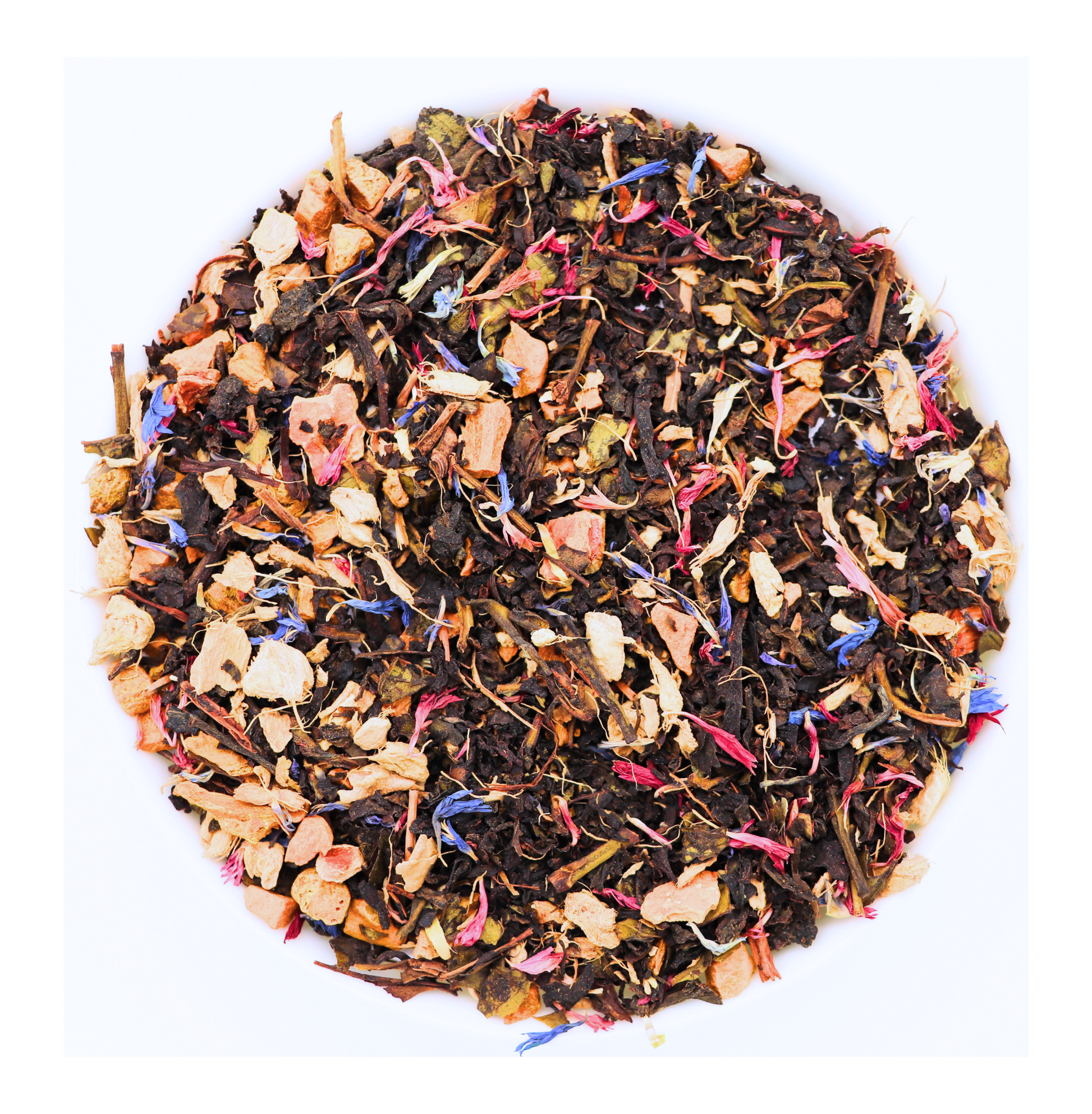 Ingredients:  Green tea, Black tea, Turmeric, Ginger, Bael Nut, Cornflower petals, Natural flavors (organic compliant).